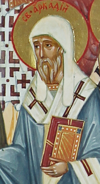 Непродолжительное время управления его Новгородской епархией было тяжелое. В самый год посвящения св. Аркадия в Новгороде Божиим попущением сделался сильный мор на людей, на коней и на рогатый скот: умирало столько народа и скота, что от трупного запаха нельзя было пройти по улицам города. На третий год летом была засуха, а осенью наступили ранние морозы, от чего наступил голод, великая скорбь и нужда. Сверх этих бедствий, ниспосланных Господом за грехи людей, много было в Великом Новгороде внутренних смут и нестроений, виновниками которых были сами люди. Быстро менялись князья в вольном городе, вслед за ними и посадники, и при этом разные партии веча враждовали между собою. Были нестроения и в церковной жизни Новгородского края. В то время на Руси было много двоеверных христиан, т. е. таких, которые, приняв христианское крещение, не оставляли языческих обычаев, жизни и обрядов. Среди сельского населения были и совсем некрещеные. Приходские пастыри не отличались образованностью и разделяли суеверия своих пасомых. Все эти бедствия и нестроения обязывали епископа утешать несчастных, благотворить неимущим, обращать заблуждающихся на путь Христовой истины, неусыпно надзирать за духовенством. И св. Аркадий был истинным пастырем. Живя благочестиво и добродетельно, он святительствовал в продолжении восьми лет и многих утвердил в вере и доброй жизни, многих наставил на разум. Преставился он в 1163 г., месяца сентября в 18-й день, в среду, после вечерни. На другой день в присутствии всего причта и паствы честное тело его было торжественно погребено в южной паперти новгородского храма Святой Софии. Молитвами святого и мы да получим оставление грехов.