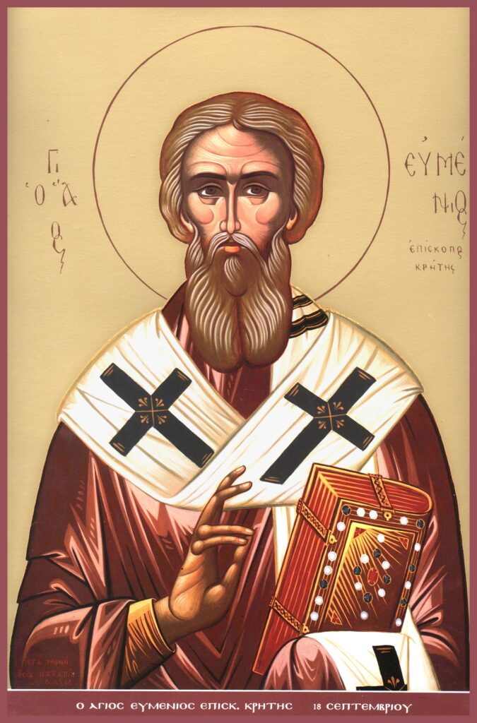 Так как добродетельная жизнь святого Евмения сияла, как бы светильник, и была для всех весьма полезна, то он был избран и возведен на престол Гортинской церкви2, и, как свеча, стоящая на подсвечнике, просветил свою паству, осиявая, как солнце, церковь Христову своими делами и поучениями: ибо свету мира подобает делами предварять слово, подобно тому как сияние предваряет для взора самый светильник. И так святой Евмений, пребывая на епископском престоле своем, учил духовных чад своих прежде всего делом, чистою и богоугодною жизнью своею являясь образцом для своего стада, а затем поучал их и словом. Сначала сам соделавшись как бы светом, потом просветил и других; сам дни и ночи поучался в законе Господне, а потом и других тому же наставил; сам, стяжав чистую совесть, очистил совесть и других. Он был весьма милостив, согласно значению своего имени3, и жизнь его была полна делами милосердия. он был отцом для сирот. богатством нищих, подателем для просящих, утешителем скорбящих, врачом страждущих и предивным чудотворцем. Однажды святой молитвою умертвил устремившегося на него большого змея; но еще большее чудо сотворил он, поправ адского змия – диавола, победив его молитвою и отогнав от врученного ему Христова стада. И не только в Гортине, но и в Риме4 святой Евмений вооружился против бесов. Прибыв в Рим, он своими знамениями и чудесами привел многих в изумление: он изгонял из людей бесов, исцелял больных и умиротворял враждующих и гневающихся. После того, он был и в Фиваиде5, где во время бездождия низвел своею молитвою с неба дождь, – и в той стране впоследствии мирно скончался, перешедши из временной жизни в жизнь вечную и нескончаемую6. Его святое тело было перенесено в Гортин, на место его служения, и с честью погребено там.