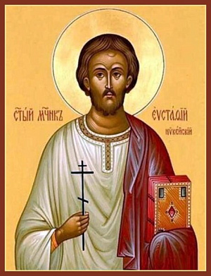 Скоро он и его супруга отошли к Господу, оставив сиротами трех благочестивых юношей: диакона Евстафия, Феспесия, и Анатолия, — братьев и по плоти и по духу, так как они единодушно служили Богу, горя духом и преуспевая в добродетели. Один придворный сановник, по имени Акилин, послал однажды своего раба купить некоторые вещи. Раб знал про этих трех благочестивых юношей, что они — купцы и имеют широкую и богатую торговлю, и отправился к ним в лавку, которую и застал открытою. Вошедши внутрь и никого не найдя, он пошел по лестнице, ведущей на третий этаж дома и услыхал голос Евстафия, читавшего псалмы Давидовы. Раб тихо поднялся по лестнице, молча вошел в верхнюю горницу6 и здесь увидал Евстафия, державшего в руках псалтирь и читавшего: «Да постыдятся все служащие истуканам, хвалящиеся идолами. Поклонитесь пред Ним, все боги» (Пс. 96:7). Кроме того, он увидел на стенах кресты и св. иконы. Ничего не сказав, он тотчас же возвратился к своему господину и рассказал ему всё, что видел и слышал. Акилин немедленно поспешил к императору Максимиану и доложил ему о том, что говорил раб. Тотчас же были посланы воины взять Евстафия и его братьев. Пришедши с рабом Акилина на место, воины нашли лавку запертою: в это время все обитатели дома находились в собрании и хранили полное молчание, причащаясь, по случаю воскресного дня, Таин Христовых. Посланные стучали в двери, звали, но ответа не было.