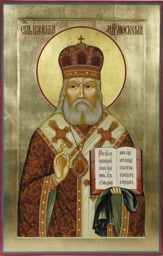 Свт. Иннокентий (в миру Иван Попов-Вениаминов), митрополит Московский (1797-1879) – выдающийся миссионер, просветитель народов Америки и Сибири. За 45 лет он крестил десятки тысяч человек, строил храмы и школы, изучал языки, быт и нравы местных народов. Его этнографические и лингвистические труды получили мировую известность: он создал грамматику алеутского языка и перевел на него богослужебные тексты. В 1868 году стал митрополитом Московским, основал Миссионерское общество и способствовал развитию миссий, в том числе Японской. Канонизирован Русской Православной Церковью в 1977 году.