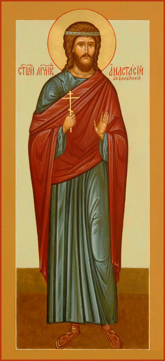 Святой Анастасий1 добровольно явился к мучителям и смело исповедал Христа Истинным Богом и Творцом всего. За такую твердость в истинной вере он был усечен мечом, и тело его было брошено в море. Одна благочестивая женщина после больших усилий постаралась достать святые мощи из моря и, умастив их благовониями и облекши погребальными одеждами, положила их в своей домашней церкви2. Многие исцеления были совершены при гробе святого.