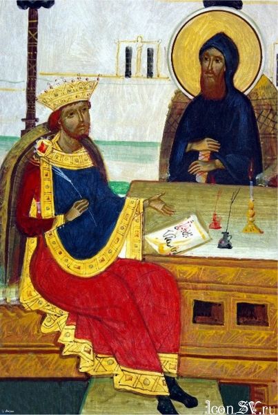 8 Св. Евфимий столп церкви, находясь и в ссылке, по свидетельству преподобного Феодора Студита был светильником, просвещающим многих и приводящим к Боту медоточивым учением своим и, таким образом, причинял беспокойство еретику-царю. Вызванный из заточения к допросу в 815 г., святой Евфимий, вместе с патриархом Никифором и другими православными епископами, ревностно обличал царя за иконоборство.