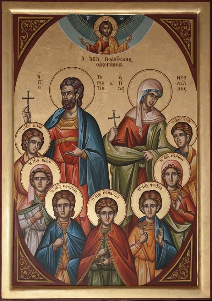 Блаженный Терентий, благочестивый христианин, сочетался законным браком с единоверною Неониллою, и от сего брака родились у них семь детей: Савил, Фот, Феодул, Иеракс, Нит, Вил и Евникия, коих они воспитали в благочестии. Когда дети вместе с родителями были схвачены нечестивыми, и представлены на беззаконное судилище, то ясно исповедовали Христа и хулили идолов. За то они были повешены и мучимы строганием, причем раны их поливали крепким уксусом и прижигали огнем. Святые же с усердием молились и утешали друг друга. Бог не презрел их моления и послал святых Своих ангелов, которые освободили их от оков и подали исцеление их язвам. Видя святых внезапно освобожденными от оков и исцелившимися от ран, нечестивые ужасались. После сего святые были брошены на съедение зверям, но не испытали никакого зла, ибо звери, по Божию повелению, были кротки как овцы. Тогда они были брошены в котел с кипящею смолою, но тотчас огонь угас и котел охладился, а смола стала похожа на холодную воду. Видя, что муки вовсе не наносят вреда святым, злочестивые мучители мечем отсекли им головы1.