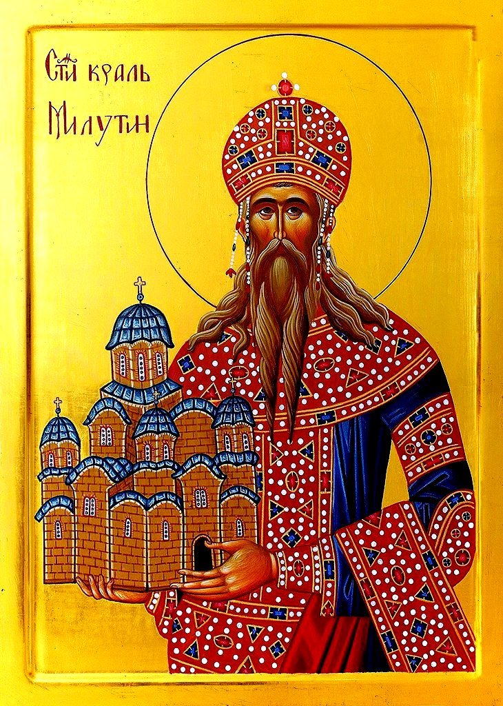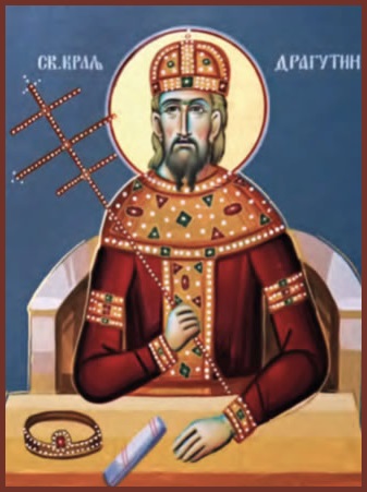 Старший брат его Драгутин недолго управлял всей Сербией (1270–1275 г.). Сломав себе ногу, он отяготился в душе тем, что для него отец удалён был с престола, и добровольно предоставил престол Сербии брату своему Милютину, а сам поселился в Среме[3]. – Драгутин, мало виновный в печальной участи отца, действовал так не только по голосу нежной своей совести, но и по убеждениям Сербского народа, весьма строгого чтителя заповеди Божией: чти отца твоего и матерь твою. Вот что пишет Серб биограф блаженного Стефана деспота: «уважение Сербов к родителям так велико, что ни один сын, хотя бы и в своём доме, не смеет вкушать пищу вместе с отцом своим, а стоит у стола, как слуга. Это можно видеть как у богатых, так и у бедных, не исключая крайней нищеты. И не слышно, чтобы кто-либо оскорбил отца своего или мать»[4]. После того понятно, что не легко было Драгутину примирить с собой и мать свою; но он, наконец, примирил её с собой. Младший брат, хотя и король всей Сербии, уважал старшего, предоставив ему титул короля Сремского, и они соединяли свои силы, когда нужно было действовать против сторонних врагов. Драгутин много трудился над обращением Босанских еретиков – Богомилов к правоверию и был чудным подвижником Божиим, закрытым от взора людей. По известию духовника его, после немногих годов супружества, не касался он тела жены своей, а жил с ней, как брат с сестрой; милостыню нищим, обителям иноческим и храмам раздавал щедрой рукой; между прочим посылал он дары и храмам России, столько страдавшей от Татар; он был в дружеской связи с великим князем Василием Ярославичем († 1276 г.). Для тайных подвигов выкопана была у него могила; в ней набросаны были каменья и черепья; здесь-то проливал он слёзы о грехах и проводил ночи в молитвах; когда от утомления засыпал, острые каменья скоро пробуждали его. Перед смертью († марта 22-го 1316 года) принял монашество с именем Феоктиста. Когда готовили его к гробу, «обретоша его препоясавшася острою тростью по нагу и во власяное вретище облеченна и тростину влепшуся до внутренния кости; хотяще отъяти от тела его, не возмогоша, и на мнозе мыюще водою, едва разлучиша оную от тела сего блаженнаго»[5].