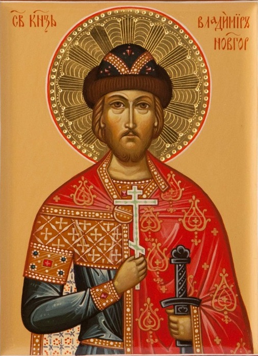 Св. блгв. князь Владимир Ярославич (1020–1052) был старшим сыном св. Ярослава Мудрого и с 14 лет правил в Новгороде. Прославился как благочестивый христианин и защитник Отечества. По его повелению в Новгороде был возведён каменный Софийский собор, освящённый в 1052 году. Князь усердно изучал Священное Писание. Скончался в возрасте 32 лет, всего через 20 дней после освящения Софийского храма, и был погребён в его стенах. Память ему была установлена в 1439 году.