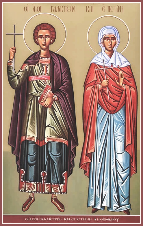 — Довольно с меня, святые отцы, пользоваться и вашим поучением, а сестру свою я не хочу видеть до тех пор, пока не придет время, когда Сам Господь повелит мне видеться с нею. И святая Епистима, сестра его о Христе, жила в своем монастыре при святой диакониссе, подобно Ангелу Божию, проводя время, подобно Галактиону, в подвигах и трудах и ни в чем не отставая по жизни от своего брата. Оба они были, как два светильника, горящие любовью к Богу, а подвизавшиеся вместе с ними иноки поучались примером их добродетельной жизни и прославляли Отца Небесного.