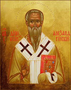 Сщмч. Дионисий Александрийский (III в.), обращенный в христианство Оригеном, был наставником Александрийской огласительной школы, а в 247 году стал епископом. Ревностно защищал православие от ересей и укреплял паству во время гонений императоров Декия и Валериана. Во время чумы в Александрии призвал верующих самоотверженно ухаживать за больными и хоронить умерших, не разделяя христиан и язычников. Скончался около 264–265 года.