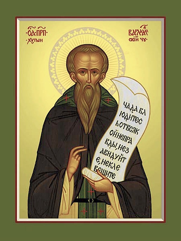 Прп. Варлаам Хутынский (XII в.) был сыном знатного новгородца. Оставив мирскую жизнь, он поселился в уединённом месте Хутынь близ Новгорода, где вёл суровую подвижническую жизнь. Со временем вокруг него собрались ученики, и был основан монастырь. Преподобный прославился даром чудотворений и прозорливости. Перед кончиной в 1192 году он завещал братии хранить веру и смирение.