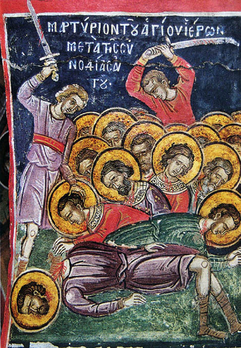 Лик мученический ясен, полк светоносен, сошед к нам разумно, церковь днесь просветил есть чудными зарями. Темже празднующе честную память их, просим от Тебе Спасе наш: тех молитвами от бед избави нас, да поем Ти: аллилуия.