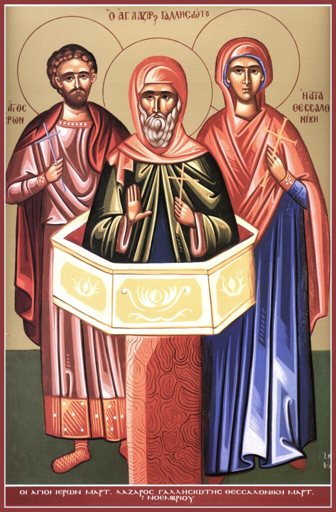 Преподобный Лазарь родился в Малой Азии, в городе Магнезии1. Пред рождением его Бог особым чудом предвозвестил явление миру сего светильника: родительский дом его облистал столь великий свет, что бывшие в нем женщины разбежались и осталась только одна мать, носившая во чреве благодатное дитя. По рождении он стал прямо и обратился в молитвенном положении к востоку со сложенными на груди руками. С детства он отличался незлобием, кротостью, состраданием и любовью к бедным. В молодых годах, обладая образованием, но чуждаясь всяких мирских удовольствий и следуя благочестивому настроению своей души, он отправился на поклонение Иерусалимской святыне, где и поступил в обитель святого Саввы2. Здесь он провел 10 лет, послушанием и всеми добродетелями превзошел всех братий и был возведен в сан священства Иерусалимским патриархом. Во святую четыредесятницу он вышел из монастыря на одну гору, ничего не взяв с собою, и питался пустынными растениями3. Здесь он услышал голос, повелевавший ему возвратиться в отечество, на пути в которое он встретил препятствие в привидениях вражеских, но превозмог их. На родине он встретился с матерью, но не остался с нею. Стремясь к пустынной жизни, Лазарь поселился на необитаемой горе Галисий, недалеко от Ефеса. Здесь, во время молитвы, он поражен был однажды следующим видением: он увидал огненный столб, восходящий на небо и окруженный множеством Ангелов, воспевавших: «да воскреснет Бог и расточатся враги Его»! Он принял это за указание свыше и построил на этом месте храм во имя Воскресения Христова, при содействии Византийского императора Константина Мономаха4. Святый Лазарь при храме устроил столп, на котором стал подвизаться в подвигах поста и молитвы, перенося зной и холод и другие тяготы столпнической жизни. Бог даровал ему дар чудес и пророчества, так что к нему стали собираться благочестивые люди, жаждавшие его руководства. Ему предсказана была Богом кончина, но братия молила его, чтобы он испросил себе у Бога, для их пользы, продолжение жизни, и Бог обещал ему продолжить ее еще на 15 лет. По прошествии 15 лет, как и пред рождением его, небесный свет облистал его столп. Когда он скончался и братия плакали над ним, что он не оставил им завещание, он встал и, как живой, дал им завещание, потом лёг и, по просьбе братии, встал вторично, чтобы сделать подпись на данном завещании, Он скончался 72 лет5, был погребен в столпе и прославлен по смерти многими чудесными исцелениями, истекшими от святых мощей его.