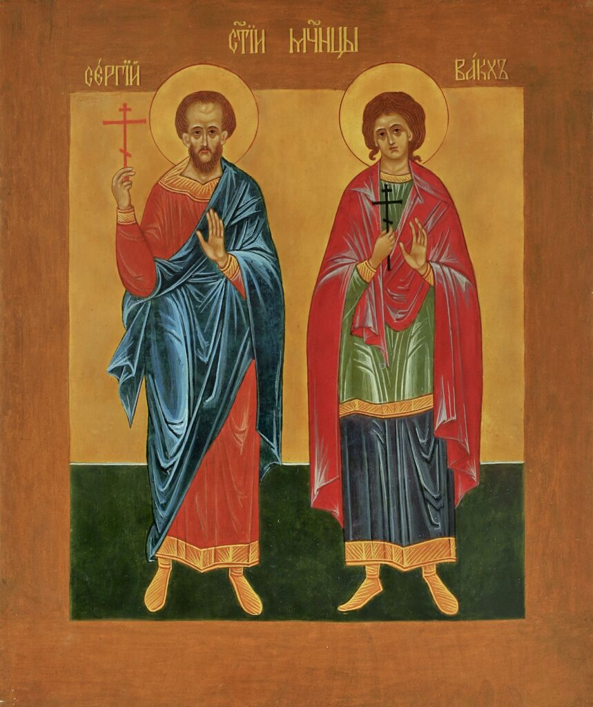 Святые мученики Сергий и Вакх, – Римляне по происхождению, – были знатными сановниками1 и первыми из вельмож при дворе царя Максимиана. Царь очень любил и уважал их за благоразумные советы на собраниях, за их храбрость на войне и за их верность в службе. И редко кто мог обратиться к царю с просьбою иначе, как только чрез этих его вернейших советников: они были в такой милости у него, как никто иной. Однако Сергий и Вакх искали милости не столько у царя земного, сколько у Царя Небесного: потому что они веровали в Господа нашего Иисуса Христа, старались угодить Ему своею жизнью и усердно служили Ему. Но из-за страха пред царем, они до времени скрывали свою веру во Христа, ибо Максимиан относился к христианам с безмерною ненавистью и неукротимою яростью. Недолго свет веры Христовой однако сокрыть в них был под спудом, и скоро для всех открылся явно.