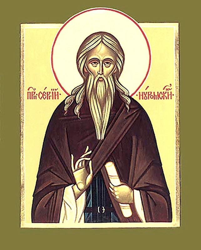 Преподобный Сергий положил начало своей иноческой жизни на святой горе Афонской1. Оттуда пришел он в Московскую державу великого Российского государства и поселился в пределах Радонежской области2. И пришел он в обитель великого Российского светила Сергия, Радонежского чудотворца3. Тогда еще был жив святой Сергий и сиял, как солнце во всей вселенной, просвещая мир благими делами и управляя о Боге своею братиею. И пробыл преподобный Сергий Нуромский у великого Российского светила Сергия под паствою долгое время, внимая ему и последуя святому житию его. Здесь он упражнялся во многих подвигах и совершил много добрых дел, так что сам преподобный Радонежский чудотворец удивлялся ему, видя такое его рвение к Богу, и любил беседовать с ним о духовных исправлениях. Преподобный же Сергий Нуромский, видя труды и подвиги сего великого светила, также старался подражать им и не уступал ему в добродетели. Все сие преподобный Сергий Нуромский принимал в сердце свое, как плодоносная земля принимает семена и впитывает дождевые воды, и принес Богу плод сторицею. И ради сего был он любим и уважаем всеми. Но не любил он мирской славы, видя в ней вред для души, и стал помышлять, как бы удалиться от людей, вспоминая слова пророка Давида: «Далеко удалился бы я, и оставался бы в пустыне; поспешил бы укрыться от вихря, от бури» (Пс.54:8-9). Так постоянно размышляя, пришел он к наставнику своему Сергию, поклонился ему до земли и, обливая слезами ланиты свои, исповедал ему свои помыслы и просил у него благословения удалиться в пустыню. Преподобный Сергий Радонежский прозрел разумными очами, что он есть сосуд, исполненный Святого Духа, и будет наставником инокам и добрым пастырем Христову стаду, благословил его, преподал ему наставления, как пребывать в пустыне, и отпустил его с миром, сказав: