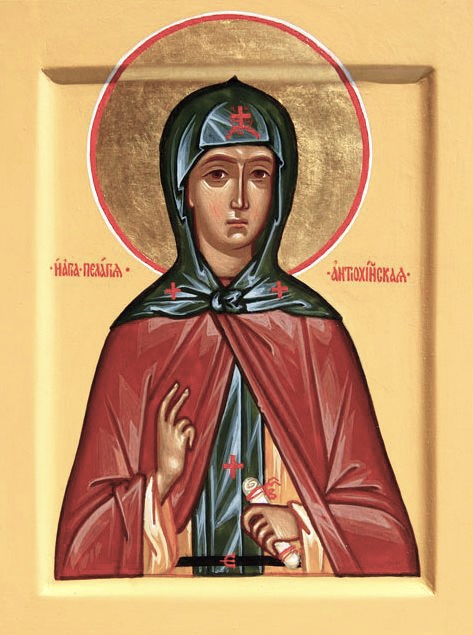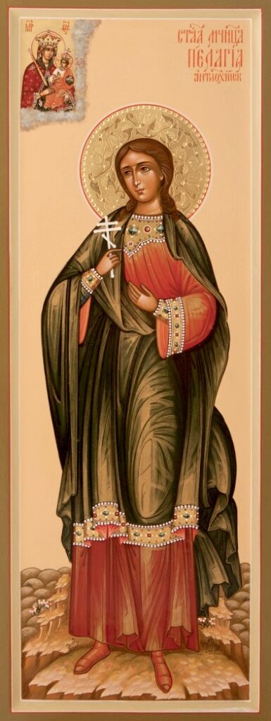 Святая Пелагия, жившая в царствование Диоклитиана в Антиохии Сирийской, происходила из знатного рода1. Правитель города, узнав, что она – христианка, послал воинов взять ее. Воины, исполняя повеление правителя, окружили дом, где жила Пелагия. Тогда она начала умолять воинов подождать, и когда они согласились, святая стала лицом к востоку на том месте, где обычно молилась, и, простерши руки и возведя очи к небу, усердно молила Бога, чтобы ей не быть отданной в руки воинов, но отойти к Нему жертвою непорочною и чистою. После сего она оделась в лучшие свои одежды, бросилась с верху дома и предала дух свой Богу2.