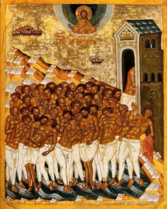 Страстоносцы всечетнии, воины Христовы четыредесяте, твердии оружницы: сквозе бо огнь и воду проидосте, и ангелом сограждане высте. С ними же молитеся Христу о иже верою хвалящих вас: слава давшему вам крепость, слава венчавшему вас, слава подавающему вами всем исцеления.