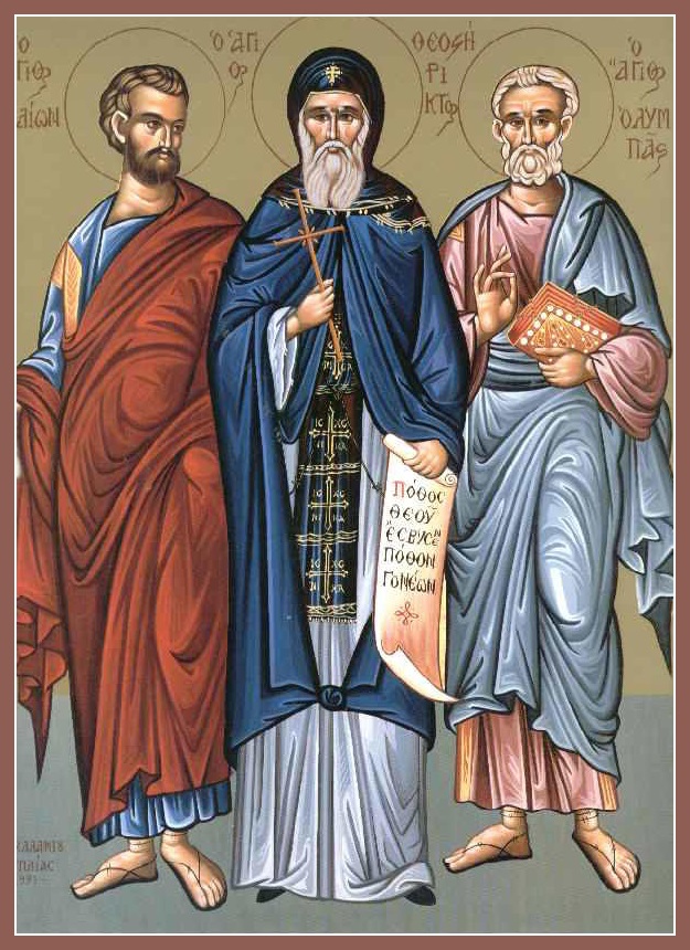 Святые принадлежали к лику семидесяти Апостолов Христовых. Из них Олимп или Олимпан, о котором вспоминает Апостол Павел в послании к Римлянам (Рим.16:15), последовал за Апостолом Петром в Рим, и там, по повелению Римского императора Нерона, был усечен мечем в тот же день, в который распять святый Апостол Петр.