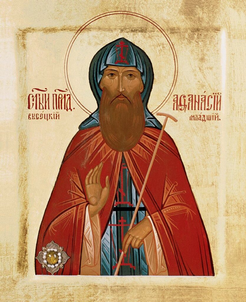 Прп. Афанасий Высоцкий Младший был вторым игуменом Серпуховского Высоцкого монастыря. Приняв монашество, он стал образцом добродетели и молитвенного подвига для братии. Скончался он 12 сентября 1395 года. Сразу после кончины прп. Афанасий был прославлен чудесами: он являлся братии, исцелял недужных и даже защитил Серпухов от вражеского нашествия. В 1994 году его мощи были обретены и перенесены в Покровский храм обители.