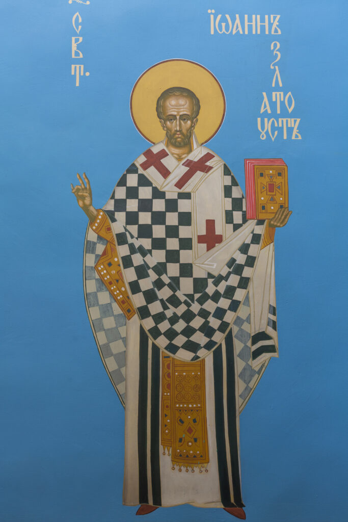 Свт. Иоанн Златоуст, архиепископ Константинопольский (IV–V вв.), ‒ величайший проповедник и богослов, один из трёх вселенских святителей. Прославился красноречием, толкованиями Св. Писания и аскетической жизнью. Будучи архипастырем, обличал пороки знати, за что был несправедливо осуждён и дважды отправлен в ссылку. Скончался в изгнании в 407 году со словами «Слава Богу за всё!». Его мощи были торжественно перенесены в Константинополь в 438 году.