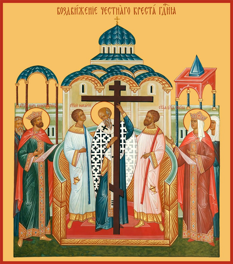 Царица Елена повелела разрушить идольский храм, землю же и камни рассыпать и раскопать. По совершении патриархом Макарием на месте том молитвы, разлилось в воздухе благоухание, и тотчас, по направлению к востоку, были обретены Гроб Христов и Лобное место, и близ его нашли зарытыми три креста, а потом и гвозди, коими был пригвожден ко кресту Господь. Когда же не могли определить, какой из найденных крестов – Крест Христов, случилось, что в то время вынесли некоего мертвеца для погребения. Тогда патриарх Макарий приказал носильщикам остановиться, и кресты были возлагаемы по очереди на мертвеца. Когда был возложен на него Крест Христов, мертвец тотчас воскрес и, силою божественного Креста Господня, встал живым6. Царица, с радостью приняв честный крест, поклонилась ему и облобызала его, – также и все бывшие с нею начальники и вельможи воинские и гражданские. Некоторые в то время, по причине тесноты, не имели возможности увидеть и облобызать святой Крест, и просили, чтобы по крайней мере издали показали бы его им. Тогда Макарий, патриарх Иерусалимский, став на возвышеннейшем месте, воздвигая Крест, показывал его народу.