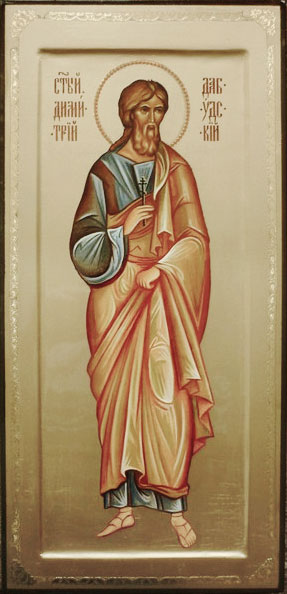 Святой мученик Димитрий происходил из селения Дабуда, во Фракии, и пострадал при императоре Максимиане Галерии и его соправителе Максимине. Фракийскому префекту Публию донесли на святого, что он христианин, и, по приказанию префекта, святой был схвачен. На допросе Димитрий смело исповедывал Христа Богом, говорил о Святом Духе и учил о воплощении Иисуса Христа, о Его благости и человеколюбии. Затем обличил душевредное идольское обольщение, показав, как слепы и глухи те, кои разделяют его. Своими речами он сильно прогневал правителя, который приказал отсечь ему голову1. Так скончался святой мученик, прияв от Господа небесный венец. Честные мощи святого Димитрия были погребены верными и богобоязненными мужами, и источают исцеления всем приходящим к ним.