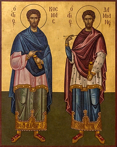 Известны три двоицы святых бессребреников-врачей с именами Космы и Дамиана. Одни из них родились от отца язычника и матери Феодотии, благочестивой христианки; они мирно скончались1 и были положены на месте называемом Фереман2. Другие жили в Риме, и скончались от руки завистливого своего учителя, который обманом завел их на гору, как бы для собирания врачебных трав, и там побил их камнями3. Третьи же, память которых ныне совершается, были уроженцами Аравийской страны. Уверовав во Христа, они стали безвозмездно врачевать бесчисленное множество больных, и не какой-либо травой или какими либо другими мироварными врачеваниями, как искусные врачи, но – силою Христовою, ибо проходя по городам и селениям, они проповедовали Христа и именем Его подавали всем болящим исцеления.