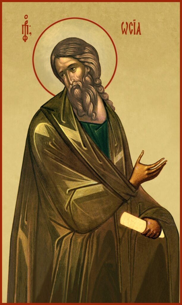 Просветившееся Духом чистое твое сердце/ пророчества бысть светлейшаго приятелище:/ зриши бо, яко настоящая, далече сущая,/ сего ради тя почитаем, пророче блаженне, Осие славне.