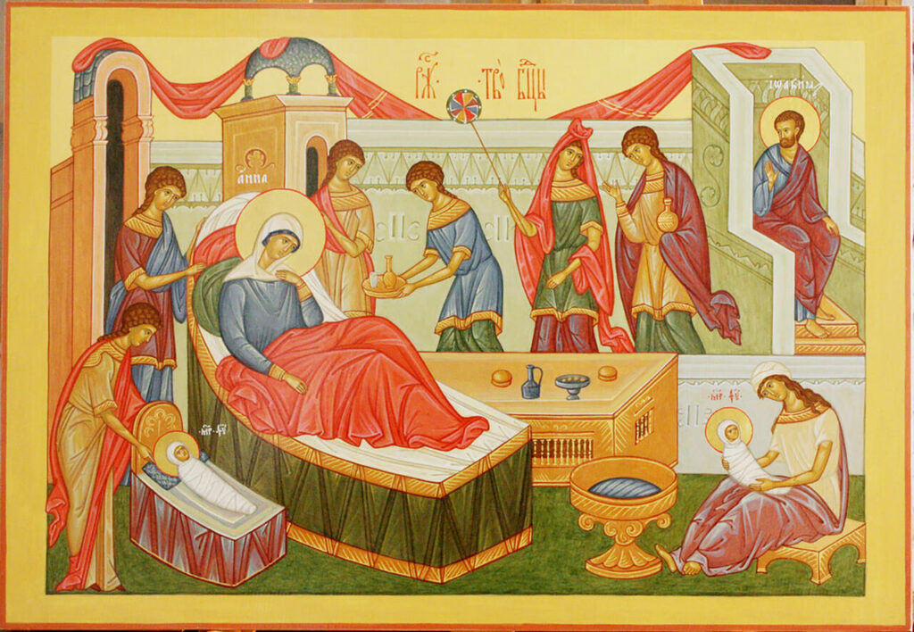 По прошествии дней чревоношения благовестие Ангела исполнилось ,и св. Анна в восьмой день сентября родила Дочь. Преблагословенная Дева, несмотря на тогдашнюю маловажность некогда знаменитого дома Давидова, в Своем рождестве наследовала высокую славу: род Ее, исходя от Авраама и Давида и продолжаясь много веков, заключил в себе имена ветхозаветных патриархов, первосвященников, правителей, вождей и царей иудейских. Доблести прославленных предков при самом рождении благодатного младенца уже украшали имя Его. Но все эти преимущества, так много ценимые миром, скоро померкли в лучезарном свете той неземной славы, которую Всевышний уготовал новорожденной Деве.